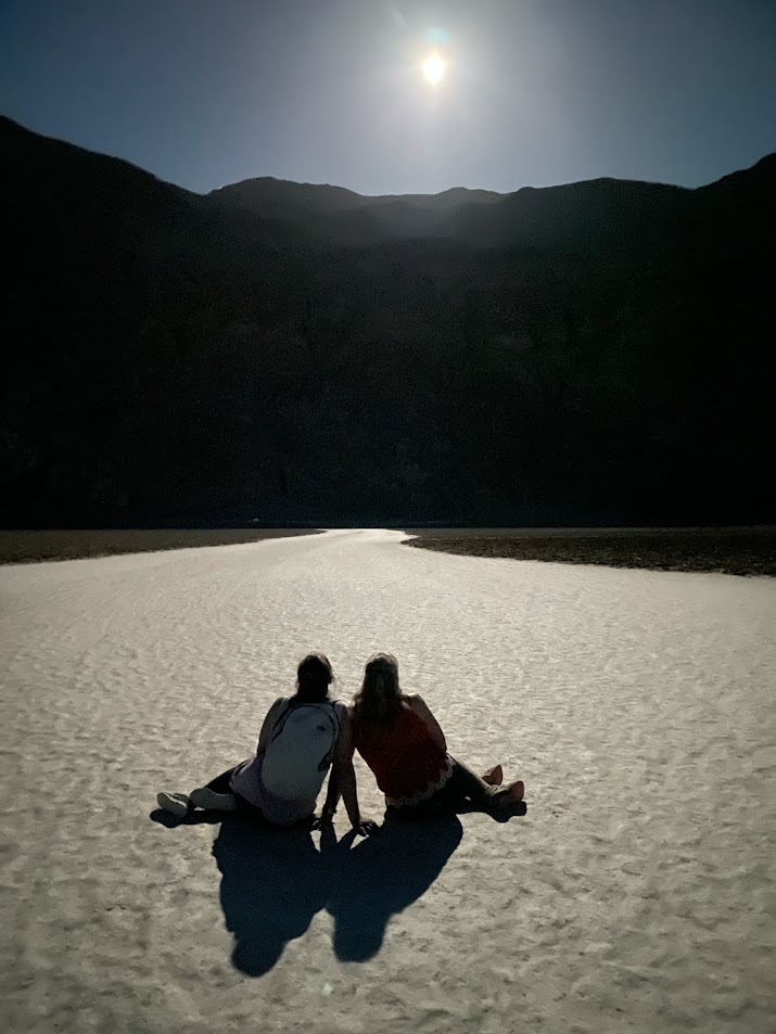 This photo was taken at midnight in Death Valley National Park inside the Badwater Basin salt flats. We had the flats entirely to ourselves. The full moon cast eerie shadows. My wife and daughter sat down to take in the ghostly beauty.