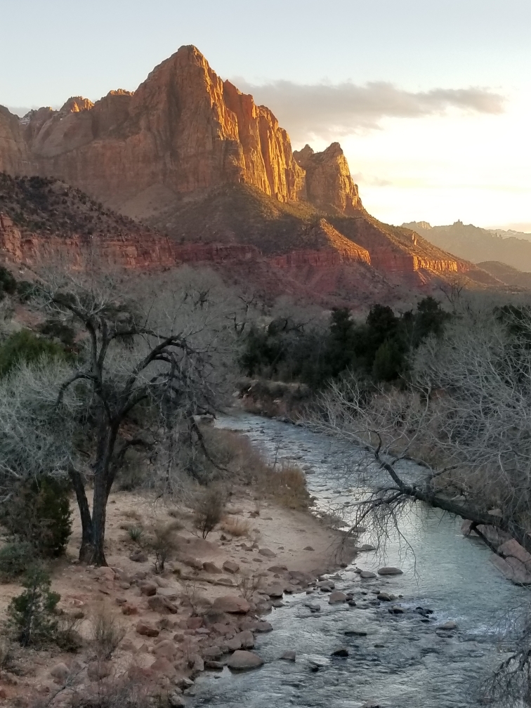 As we drove through Zion National Park we saw several photographers standing on a bridge over the stream shown in the photo. I asked one of them why they weren’t taking pictures. He said, “We are waiting for the golden hour in photography.” I kept watching and then it appeared on the mountain wall.